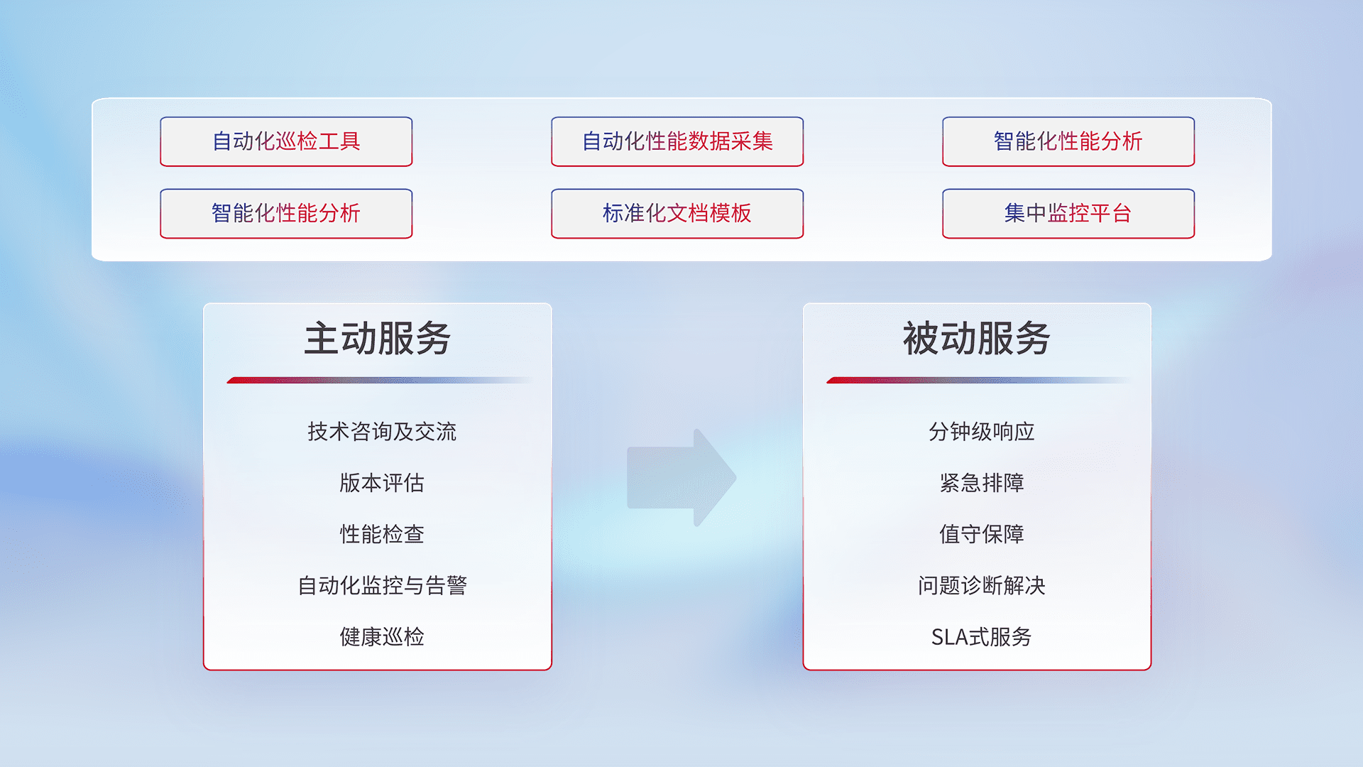 智能化工具和标准化文档,,保障服务质量,,提供主动服务(包含技术咨询、、、、版本评估、、性能检查、、自动化监控与告警、、、健康巡检)和被动服务包含(分钟级响应、、、、紧急排障、、值守保障、、、问题诊断解决、、、SLA服务)。。